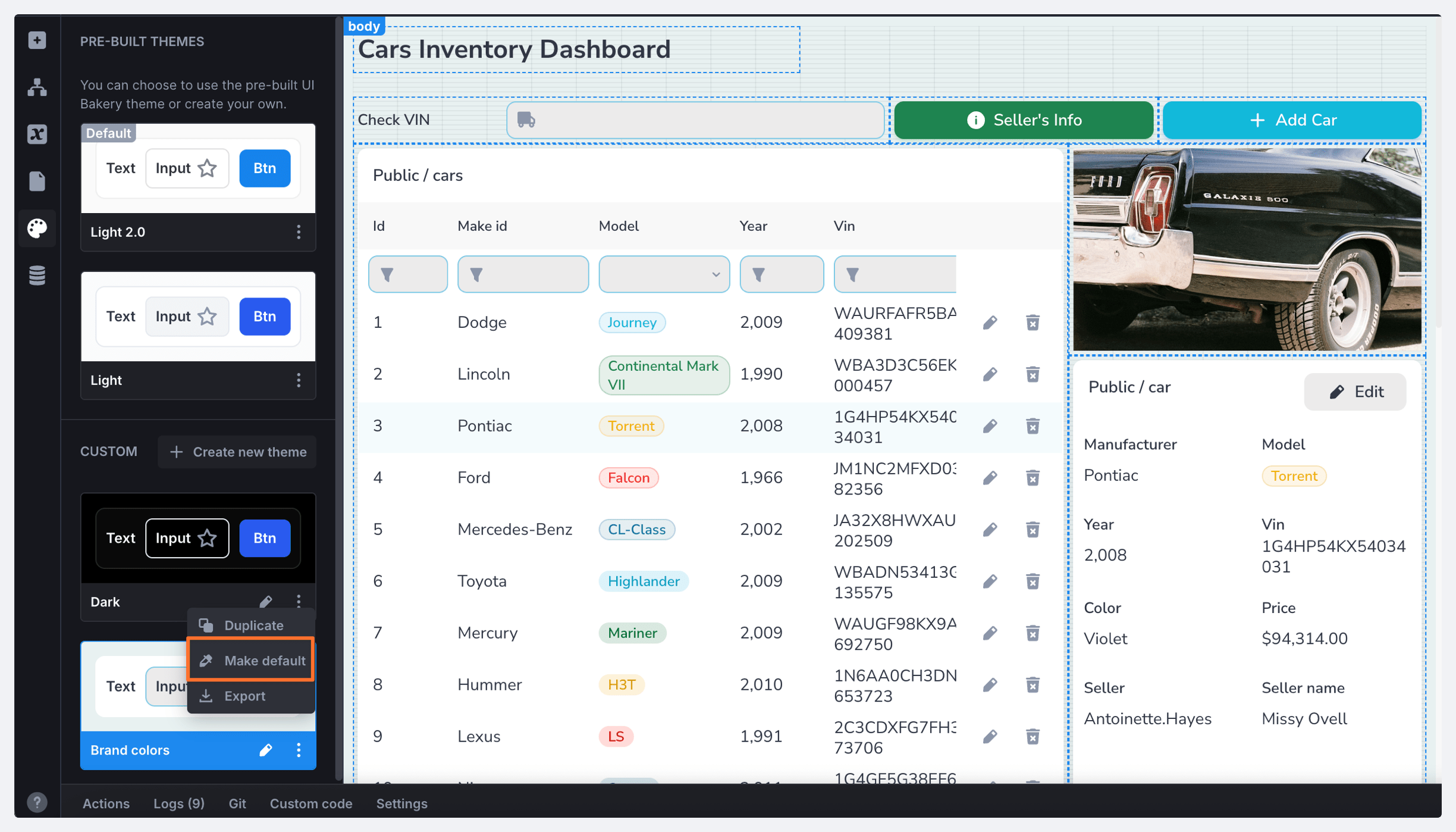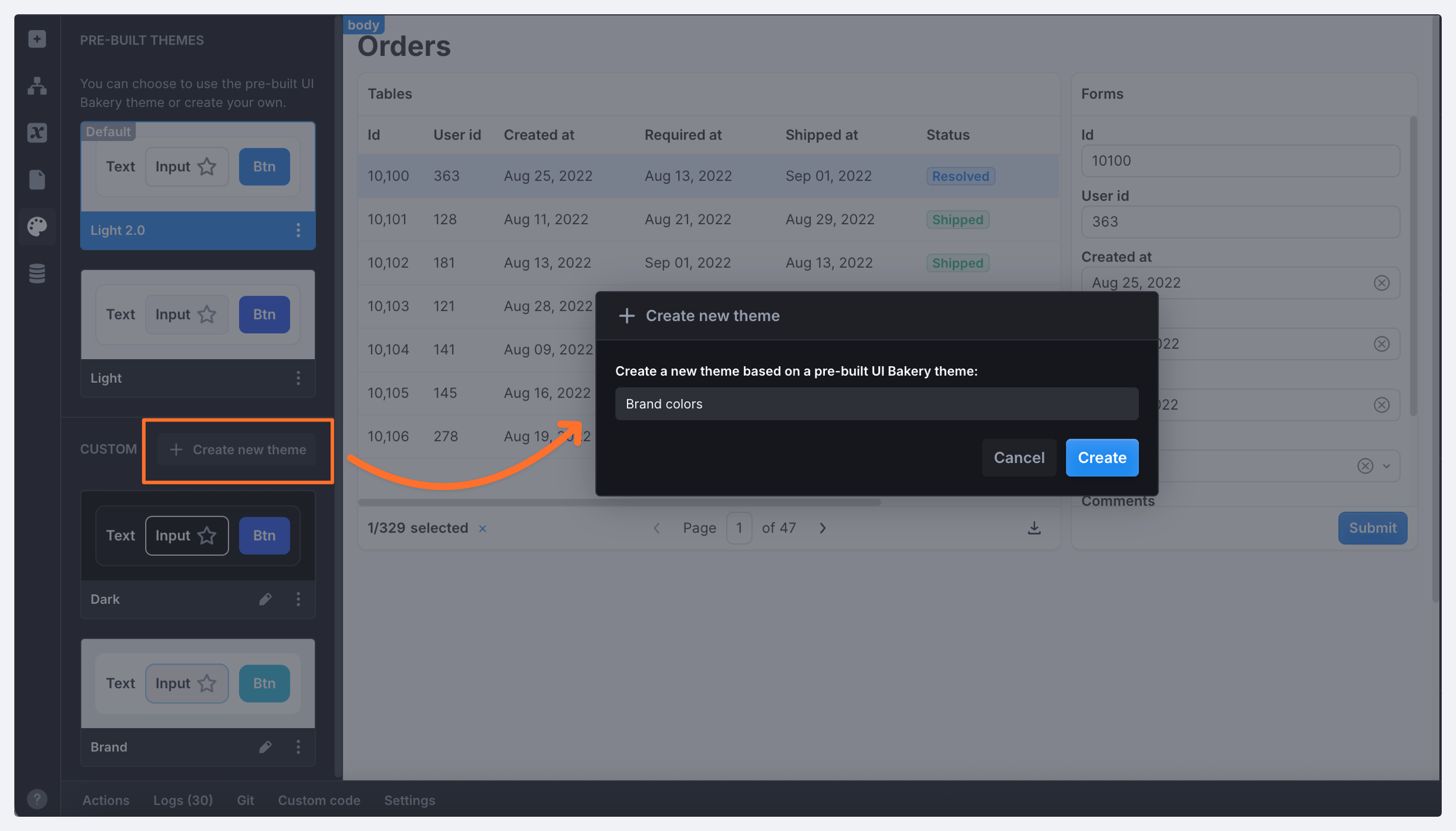 Once created, the new theme will be assigned to your current application by default. You can also assign any of pre-built UI Bakery themes to the app if you want - simply select it in the *Themes* list.