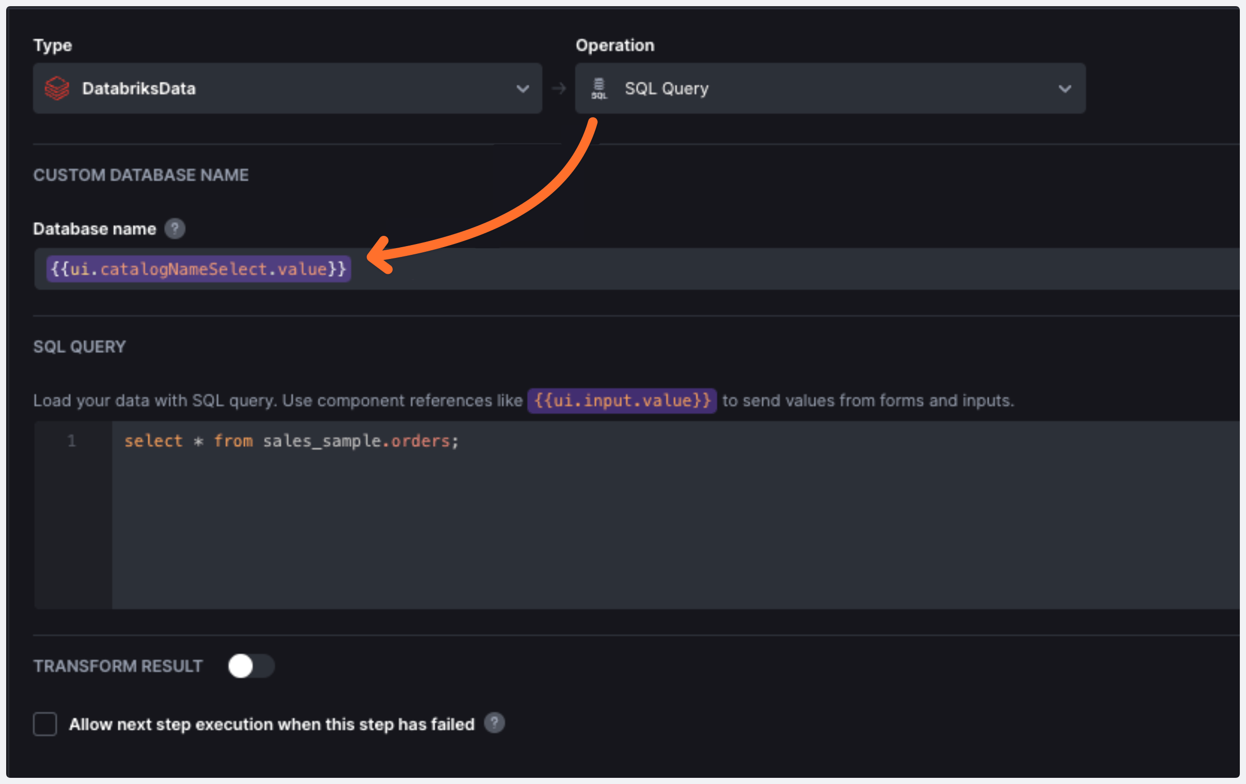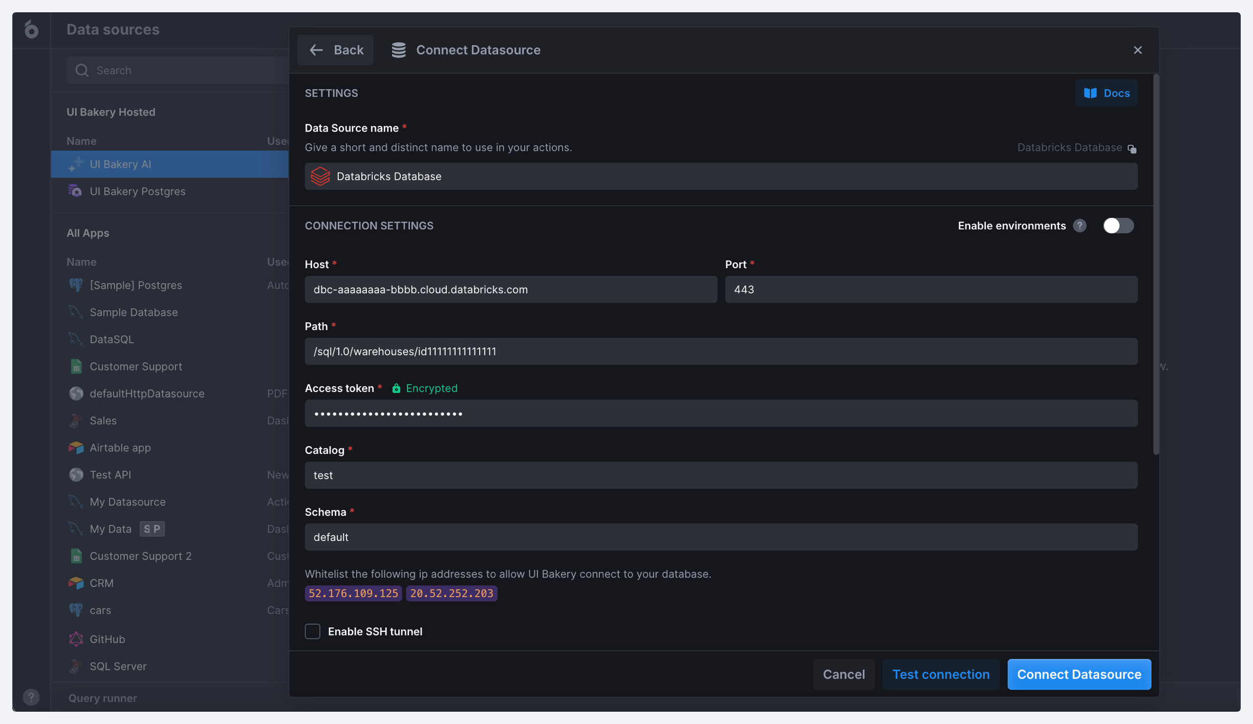 UI Bakery allows you to easily connect to a Databricks SQL database with no need for additional layers like APIs or third-party services.