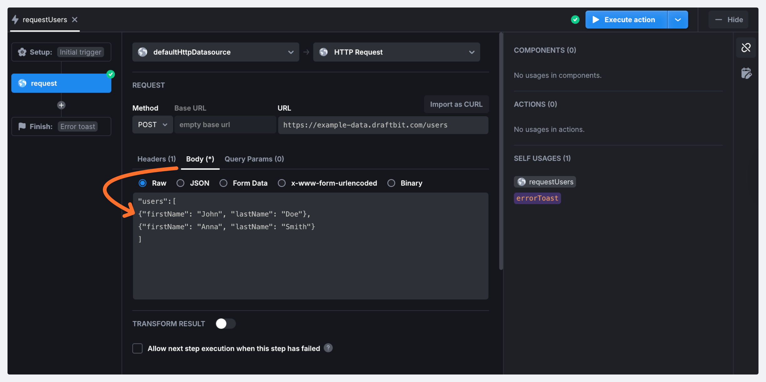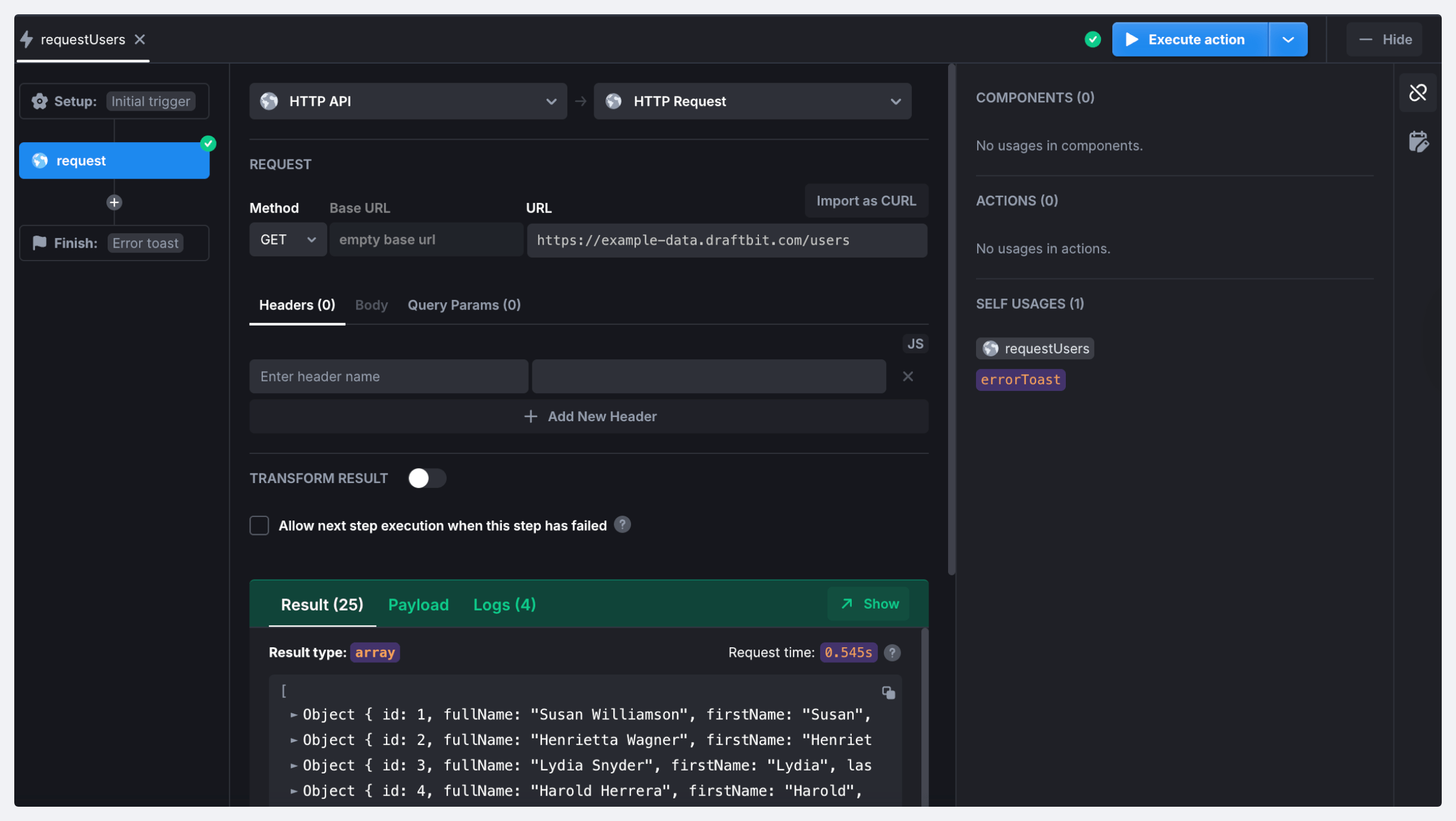 * **Transform result** toggle - You can pass a JS function to transform execution result or fix an error. The `{{data}}`, `{{error}}`, and `{{res}}` variables represents the result of the request.