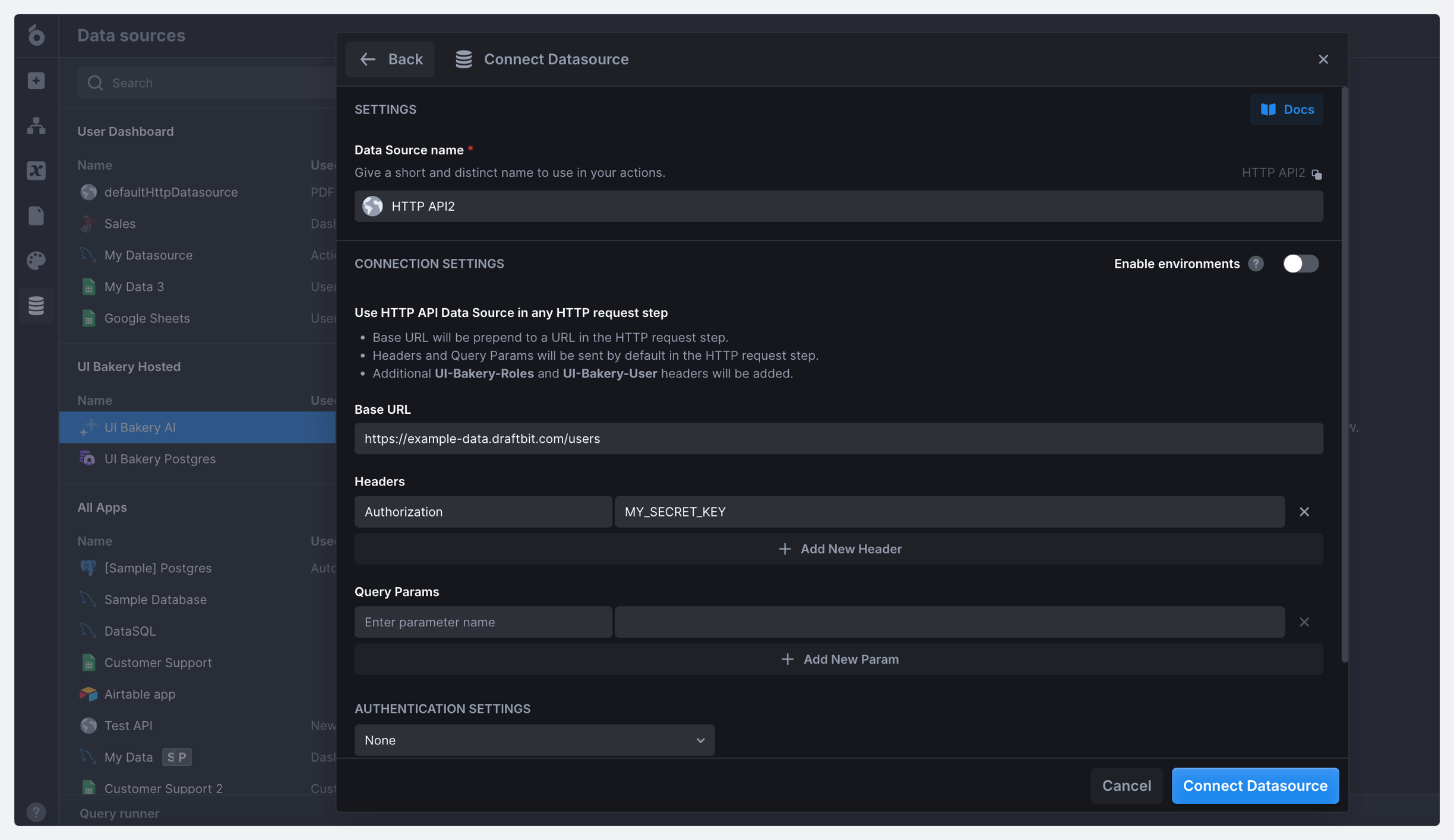 If your HTTP Requests share similar settings such as Base URL or Auth headers or your API requires authentication, you can configure your own HTTP API as a data source. To do so, follow the instruction below: