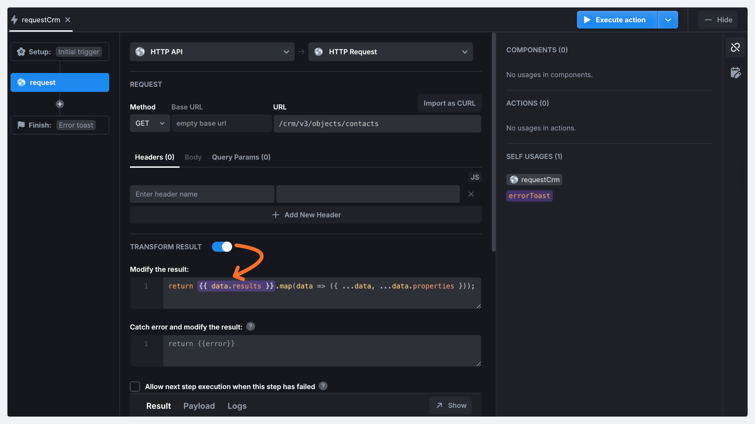 /crm/v3/objects/contacts.(Optional) Turn on the Transform result toggle and specify the following code to be able to display your data in a Table, since HubSpot returns an object instead of a collection: