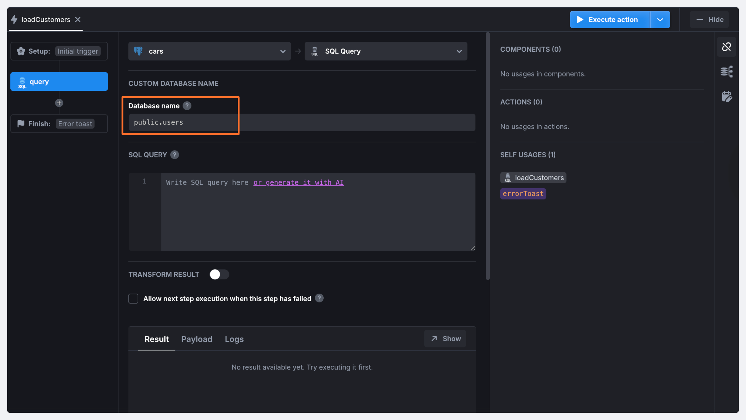 Once enabled, when configuring the action, you will be able to specify a custom database. In case a database is not specified, the default data source database will be used.