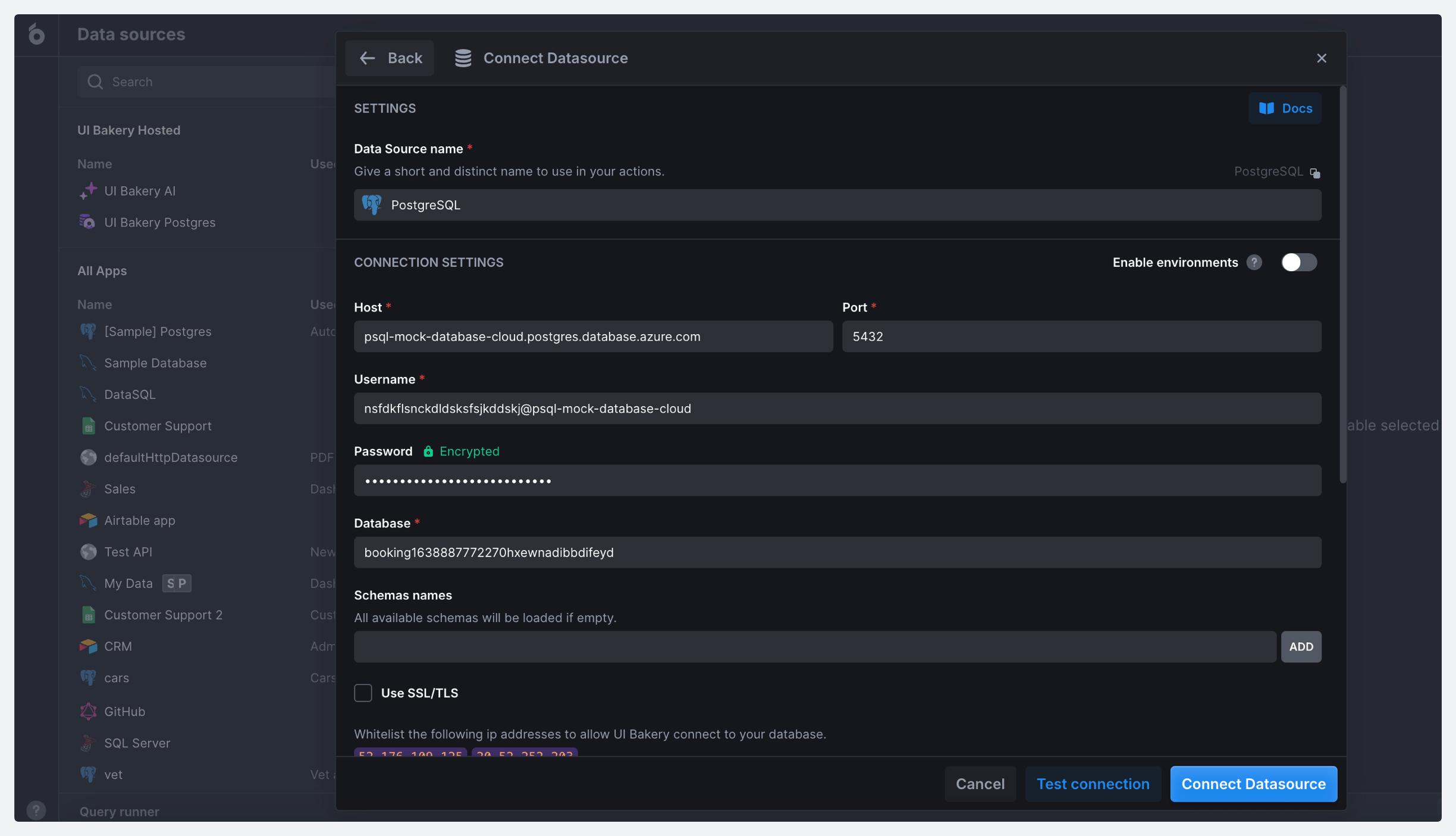 If your database is hosted behind a Firewall, you need to add our [IP addresses](https://docs.uibakery.io/concepts/data-sources#whitelisting-ip-addresses) to the Firewall whitelist.