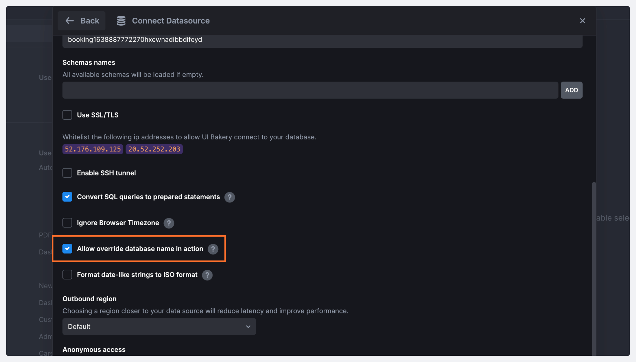 If you need to be able to override the default data source database with a custom value in an action, you can enable the **Allow override database name in action** setting.