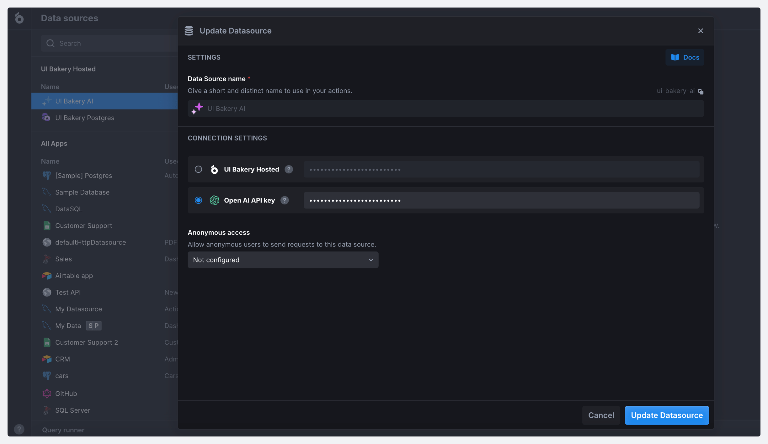 UI Bakery AI can be accessed through the Data sources page. By default, it's set up to use the Open AI API Key hosted by UI Bakery, ideal for testing and a quick start with AI actions.