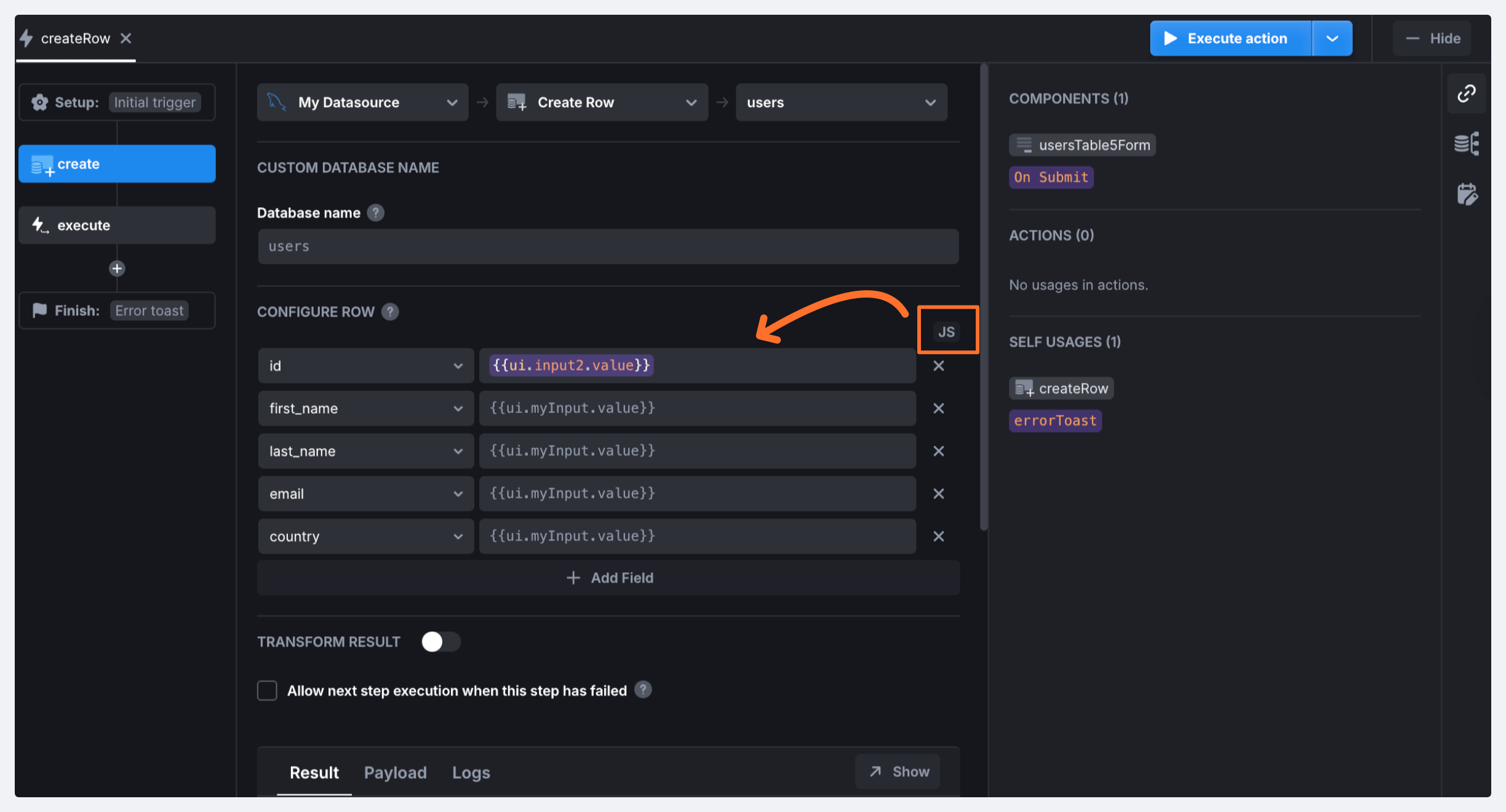 You can also send the data field by field by clicking the **JS** button on the right of the *Configure Row* section. This way, you'll switch to the *UI mode* where you can specify each column separately.