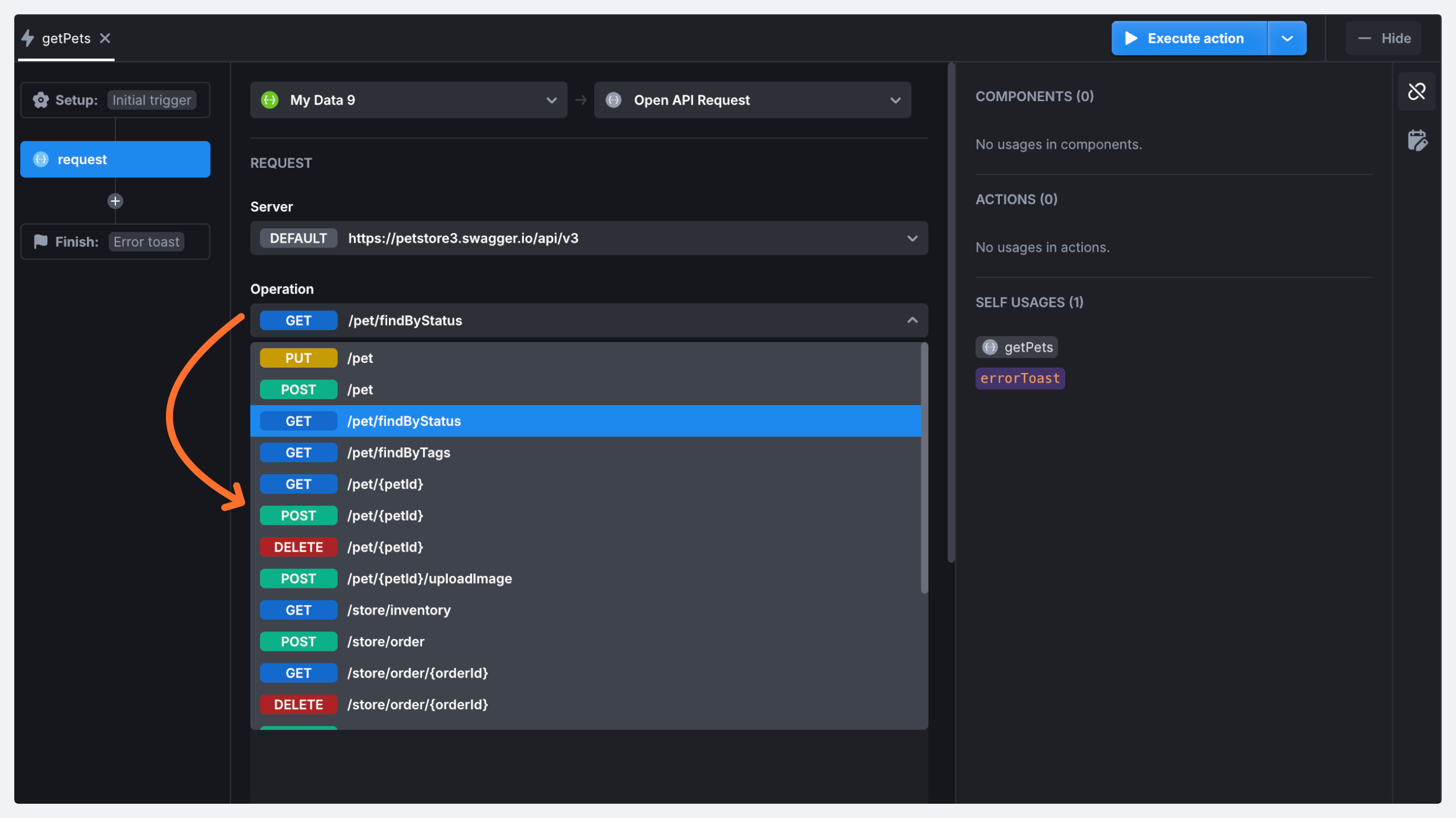 The available endpoints will be defined by the OpenAPI specification. You can select the endpoint you need from the *Operation* dropdown. The documentation will be retrieved from the specification and displayed in the Action editor.