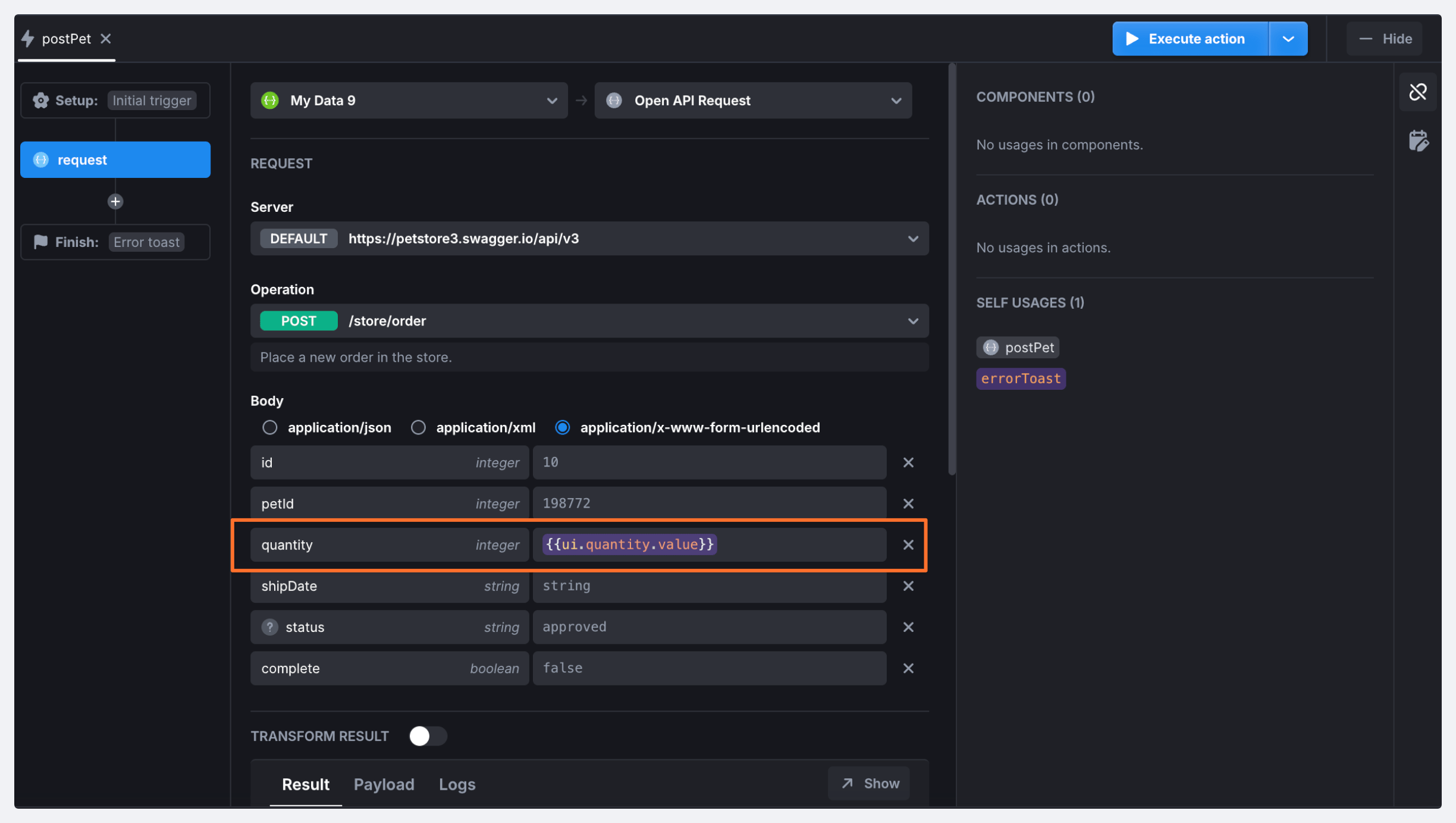 The Open API Request action steps allows you to send queries to Open API data sources.