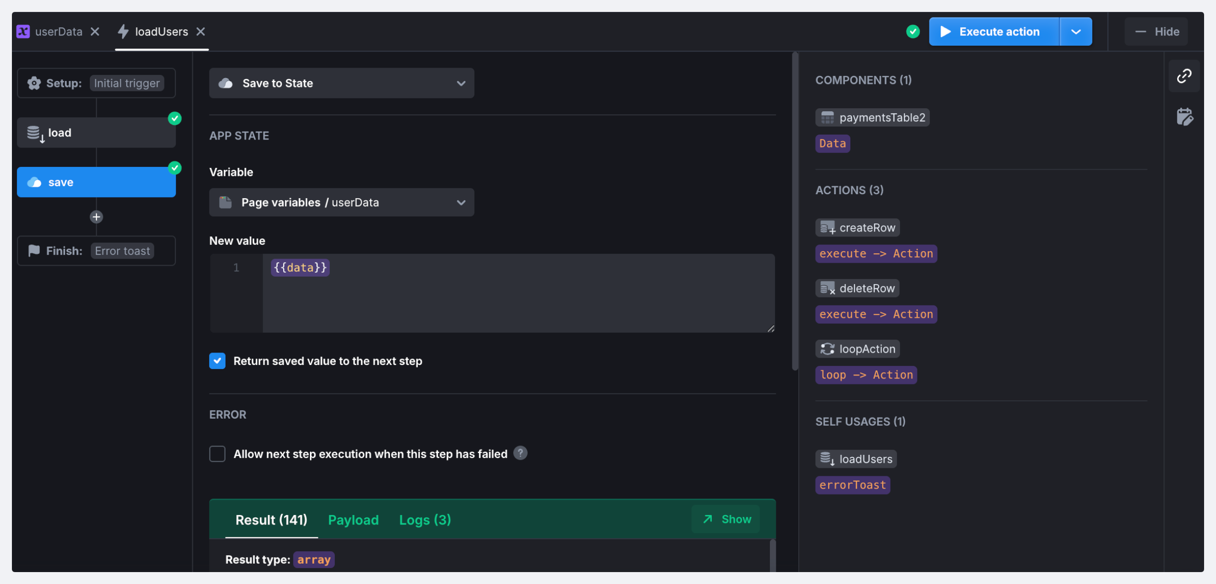 Then, you need to pass the data you want to save in the *New value* field. The saved value will be  available as `{{state.<key>}}` in all actions and components.