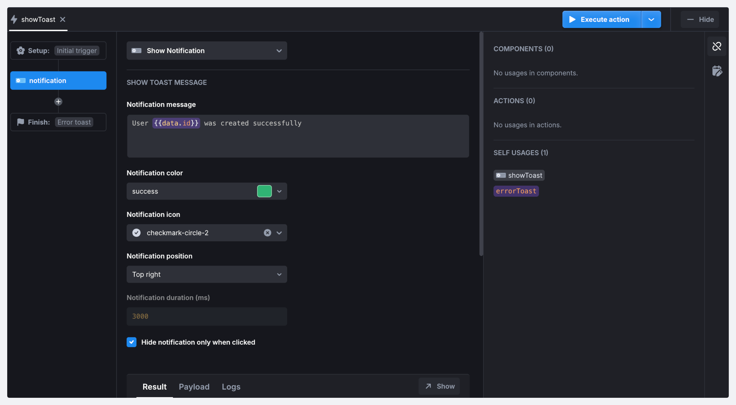 By default, the notification will be hidden after the specified duration. But if you select the **Hide notification only when clicked** checkbox, the notification will be hidden only after the user clicks it.