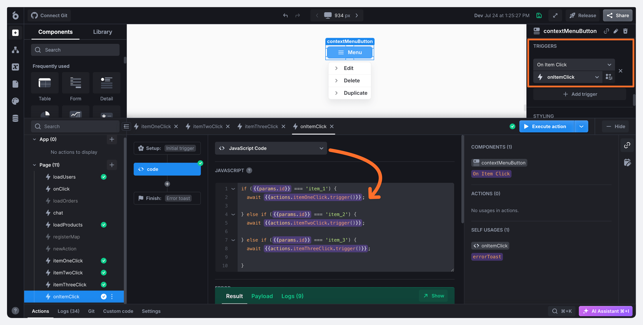 4. Assign this action to the component's **On Item Click** trigger.
