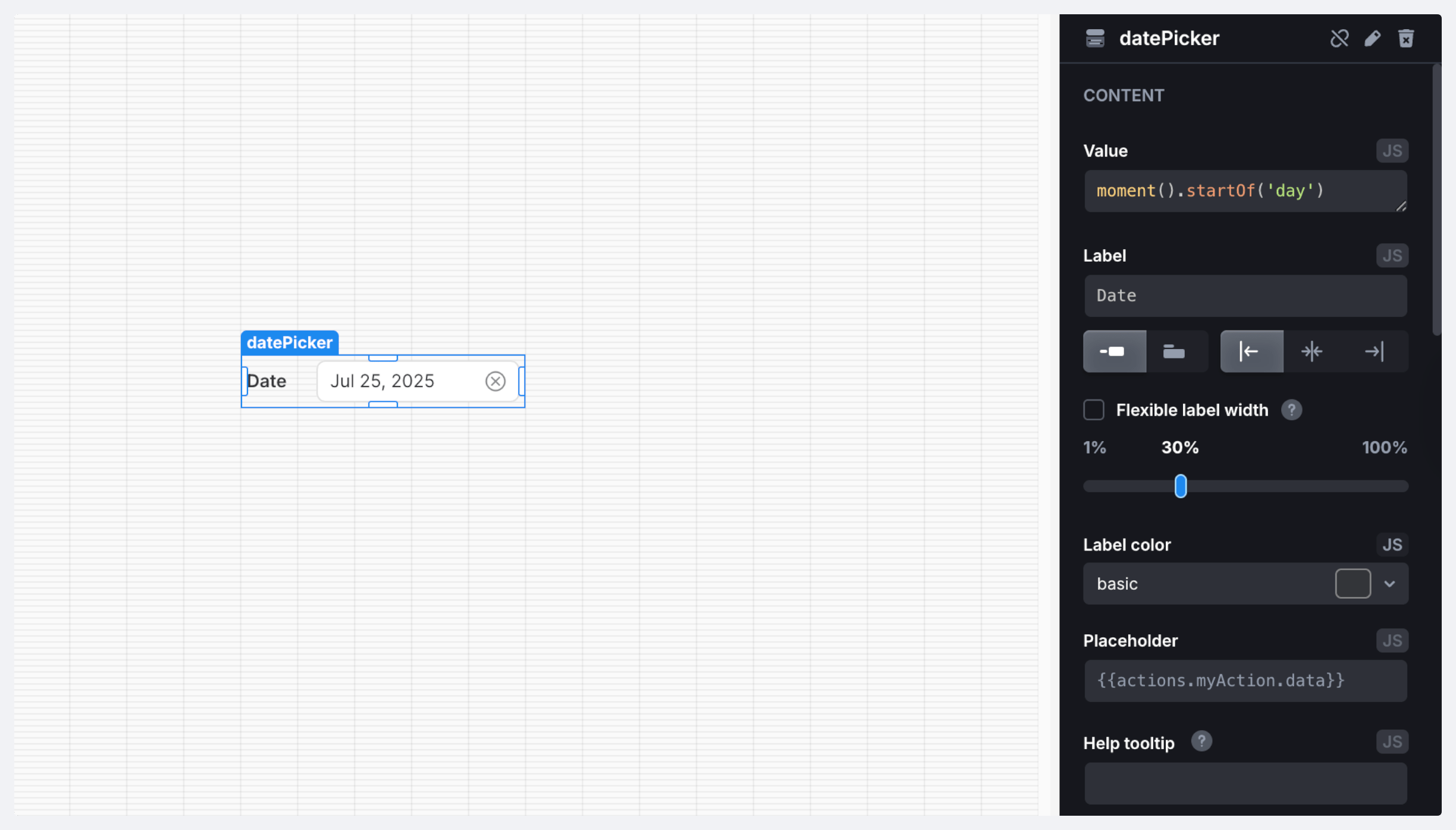The Date picker component allows you to select a date from the calendar. The field supports multiple date formats, required field, and minimum/maximum values.
