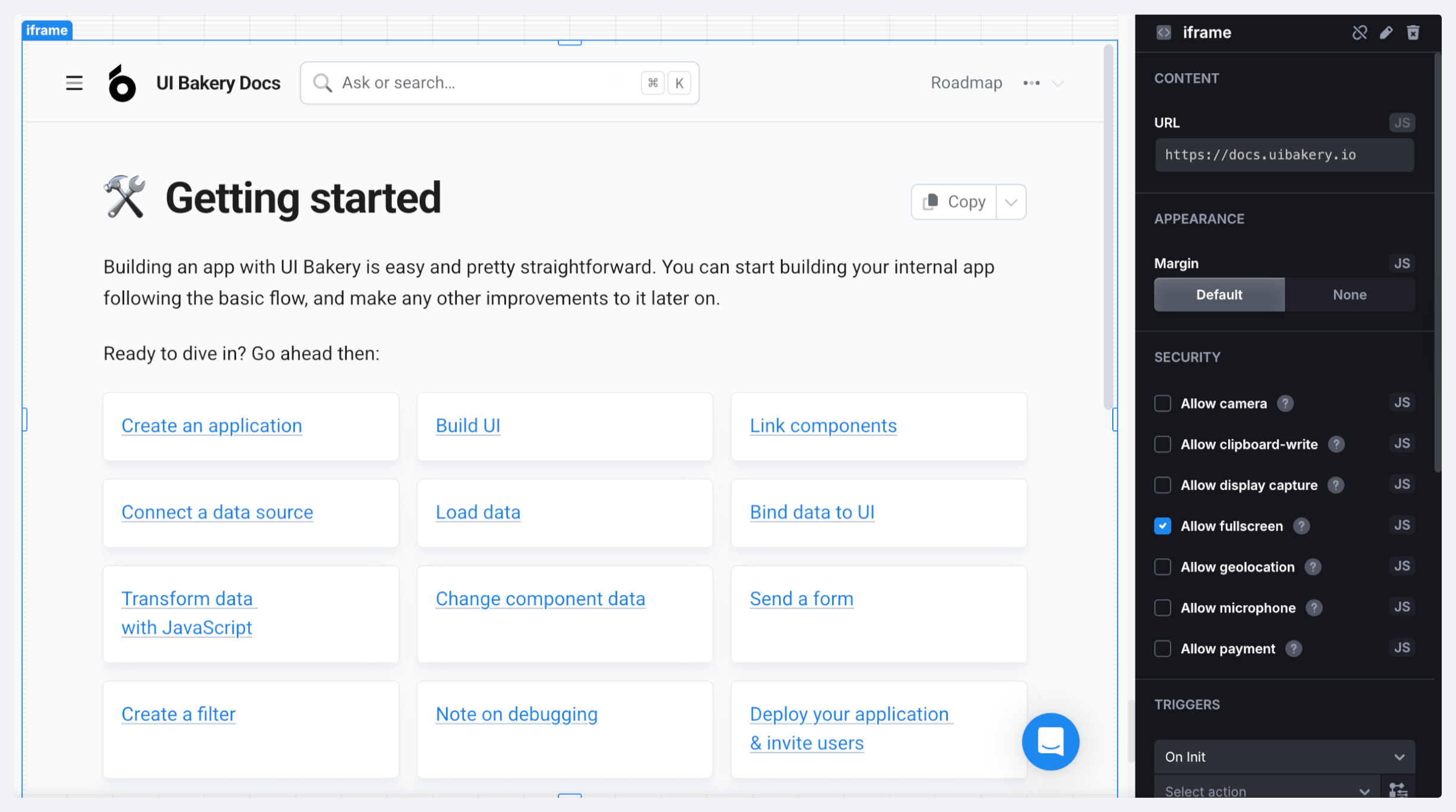The Iframe component allows you to embed web pages and external applications into UI Bakery. The component supports additional access permissions to camera and microphone, geolocation, payment collection, capture display, and clipboard-writing.