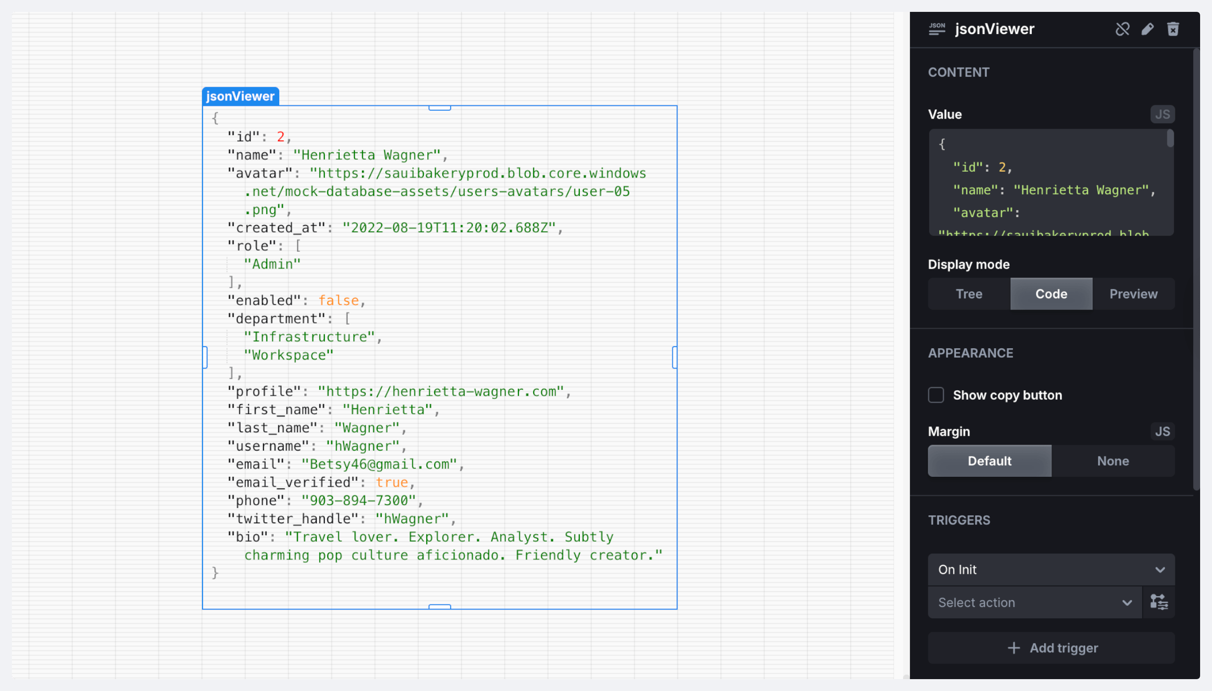 JSON Viewer displays JSON and objects highlighting the syntax. The component supports three *display modes*: Tree, Code, and Preview.
