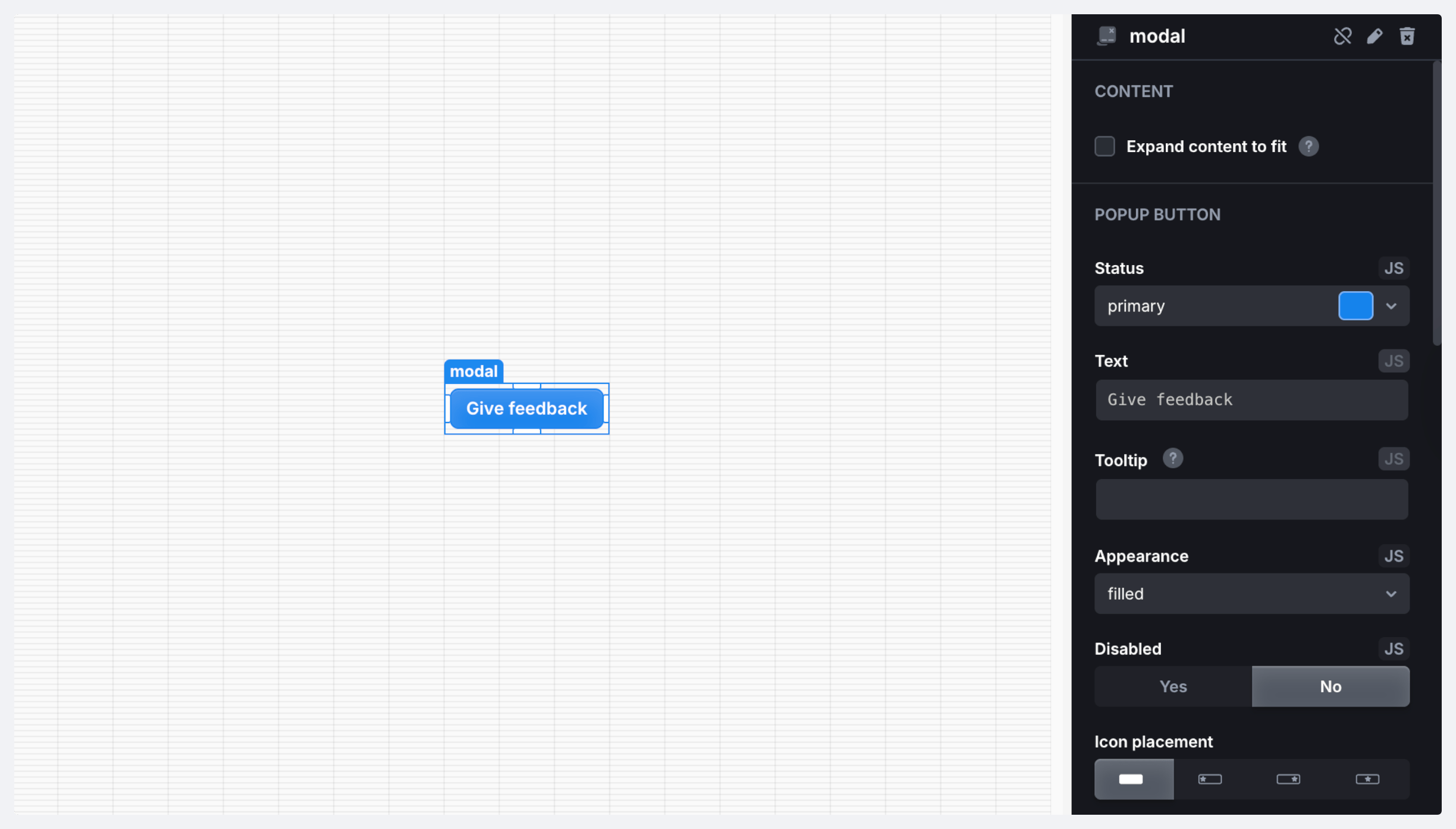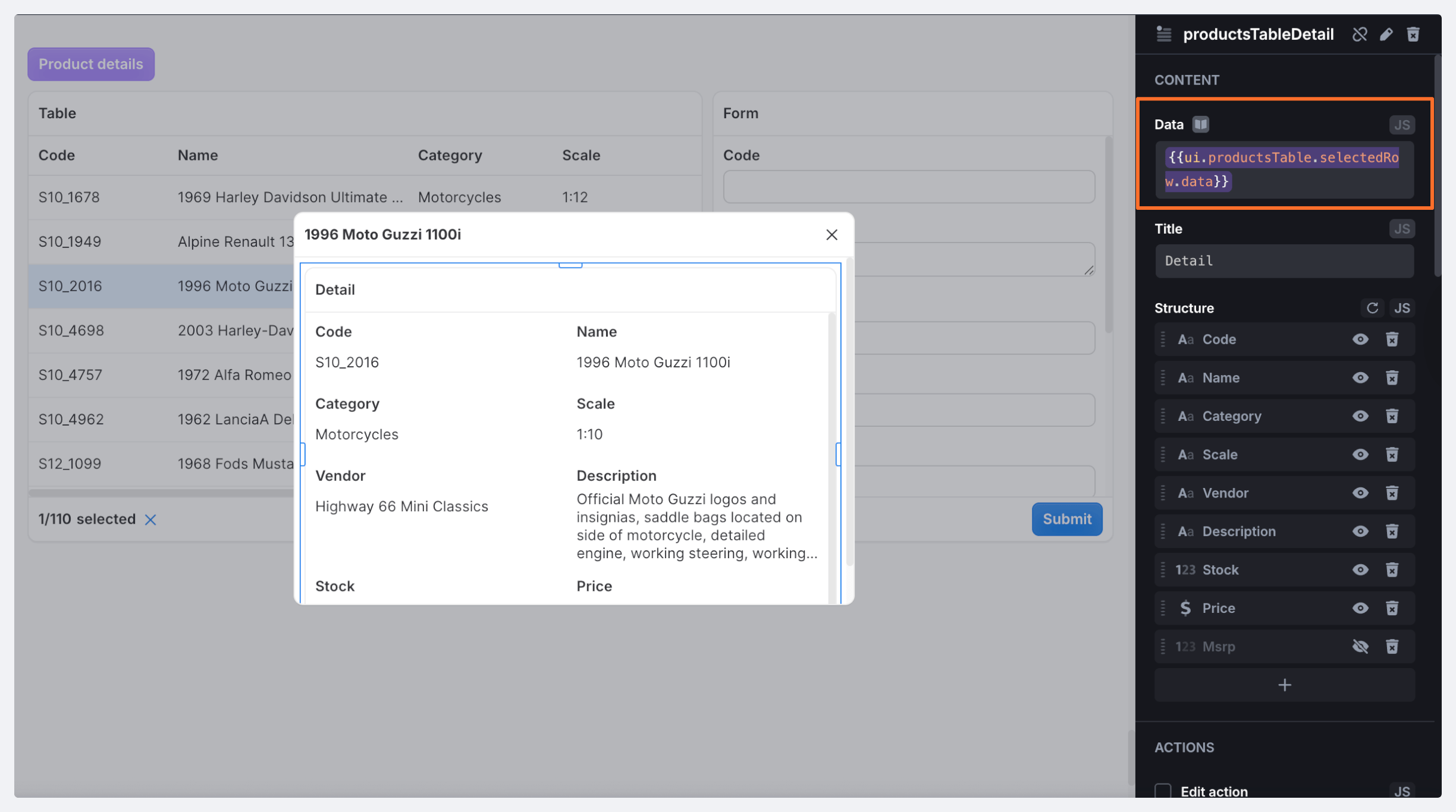 For example, you can add a Modal to display product details and place the Detail component inside the modal window. In the *Data* field of the Detail component, you need to reference the necessary data - `{{ui.productsTable.selectedRow.data}}`.