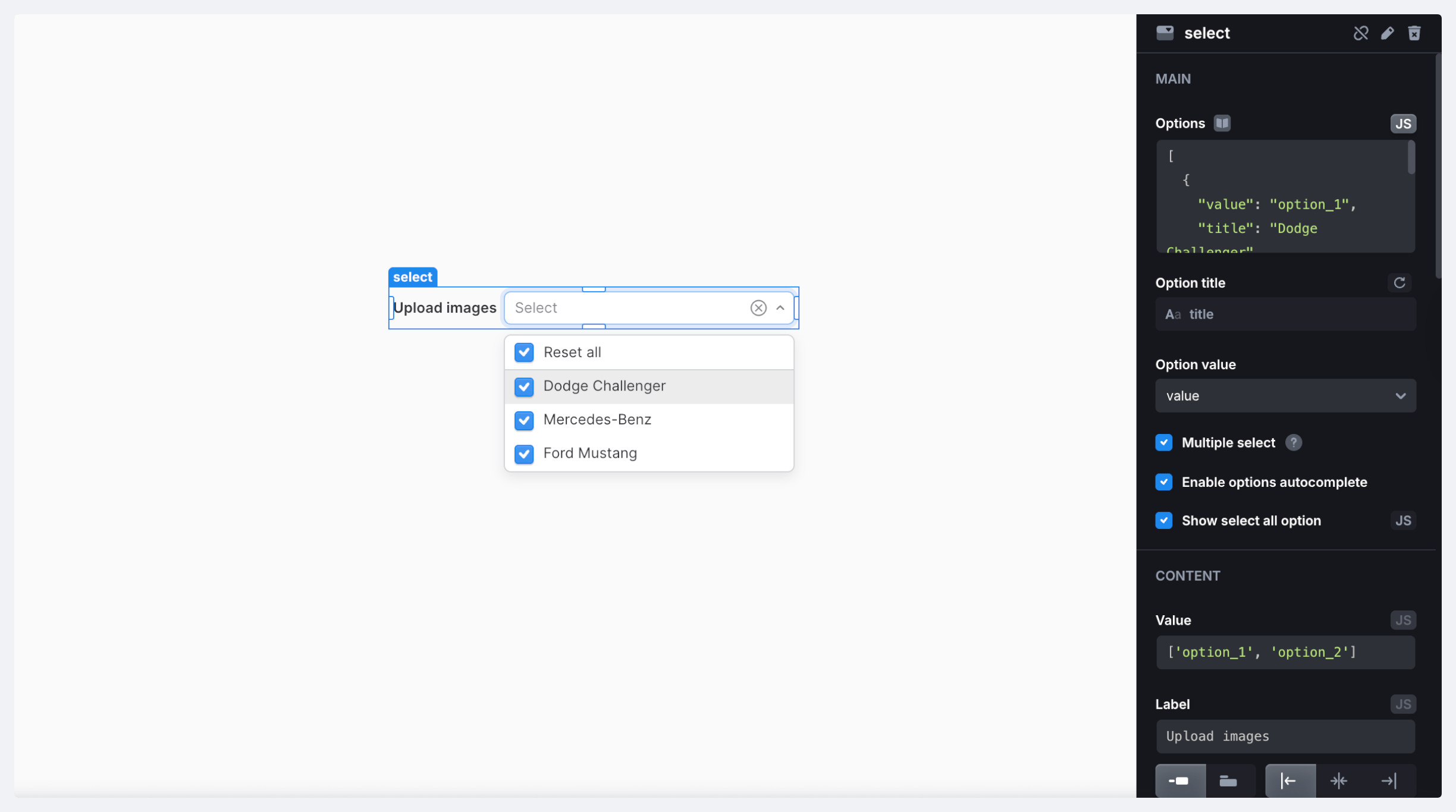 A Select field that supports the selection of multiple values. The component also supports required fields validation, minimum/maximum length, and custom rules.