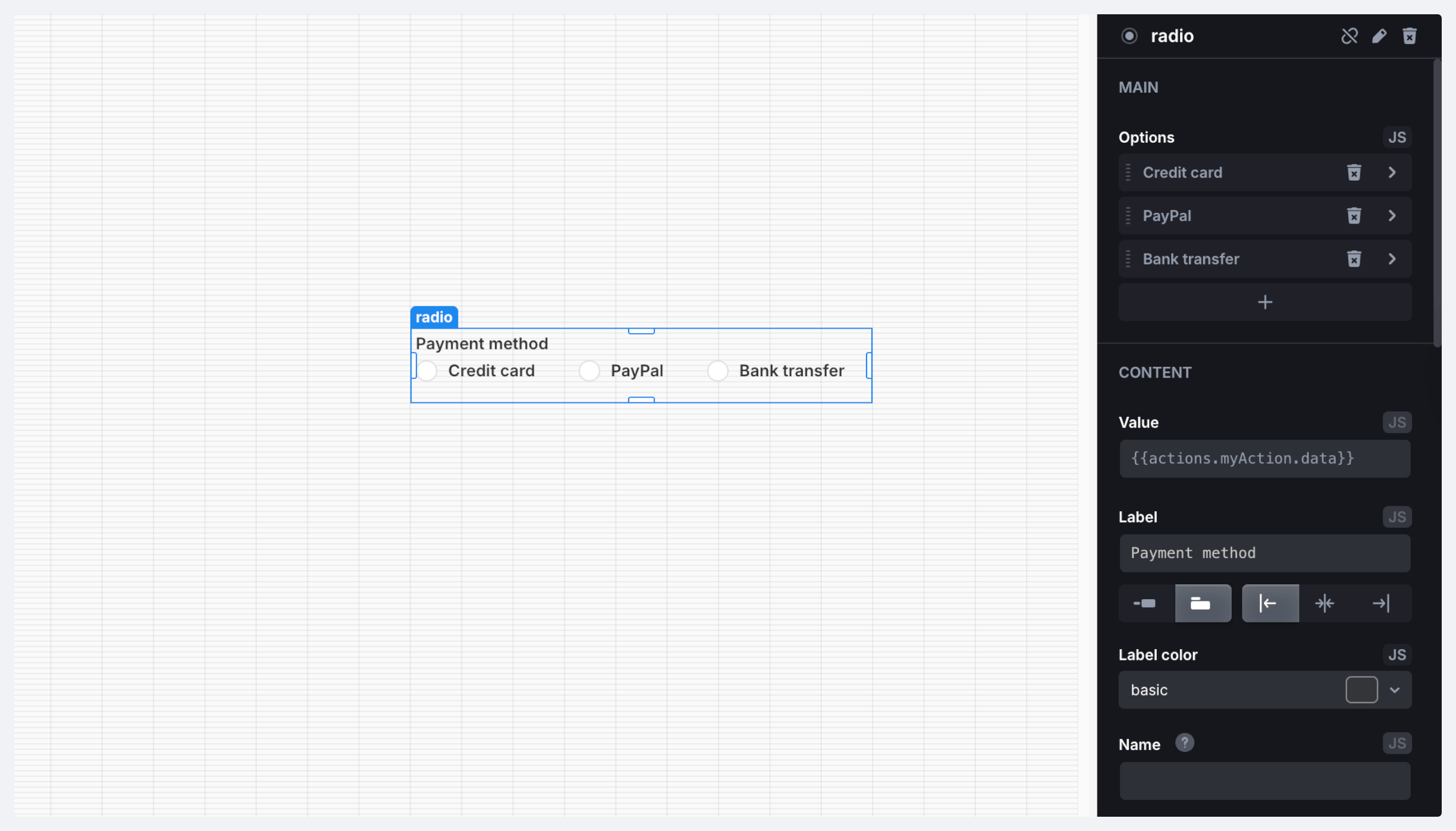 <table><thead><tr><th width="155.5390625">Name</th><th width="179.55859375">Parameters</th><th width="101.05078125">Returns</th><th>Description</th></tr></thead><tbody><tr><td><code>setValue</code></td><td><code>value: any</code></td><td><code>void</code></td><td>Set component value</td></tr><tr><td><code>setOptions</code></td><td><code>options: object[]</code></td><td><code>void</code></td><td><p>Set options for the radio component. Options is an array of objects with the following structure:<br><code>{</code><br></p><p><code>value: any;</code><br></p><p><code>label: string;</code><br></p><p><code>}</code></p></td></tr><tr><td><code>setDisabled</code></td><td><code>disabled: boolean</code></td><td><code>void</code></td><td>Disable or enable the component</td></tr><tr><td><code>reset</code></td><td>–</td><td><code>void</code></td><td>Reset component to the initial value</td></tr><tr><td><code>resetValidation</code></td><td>–</td><td><code>void</code></td><td>Clear validation errors</td></tr><tr><td><code>setErrors</code></td><td><p><code>errors: string |</code> </p><p><code>string[] | null</code></p></td><td><code>void</code></td><td>Mark the component as invalid and displays errors</td></tr></tbody></table>