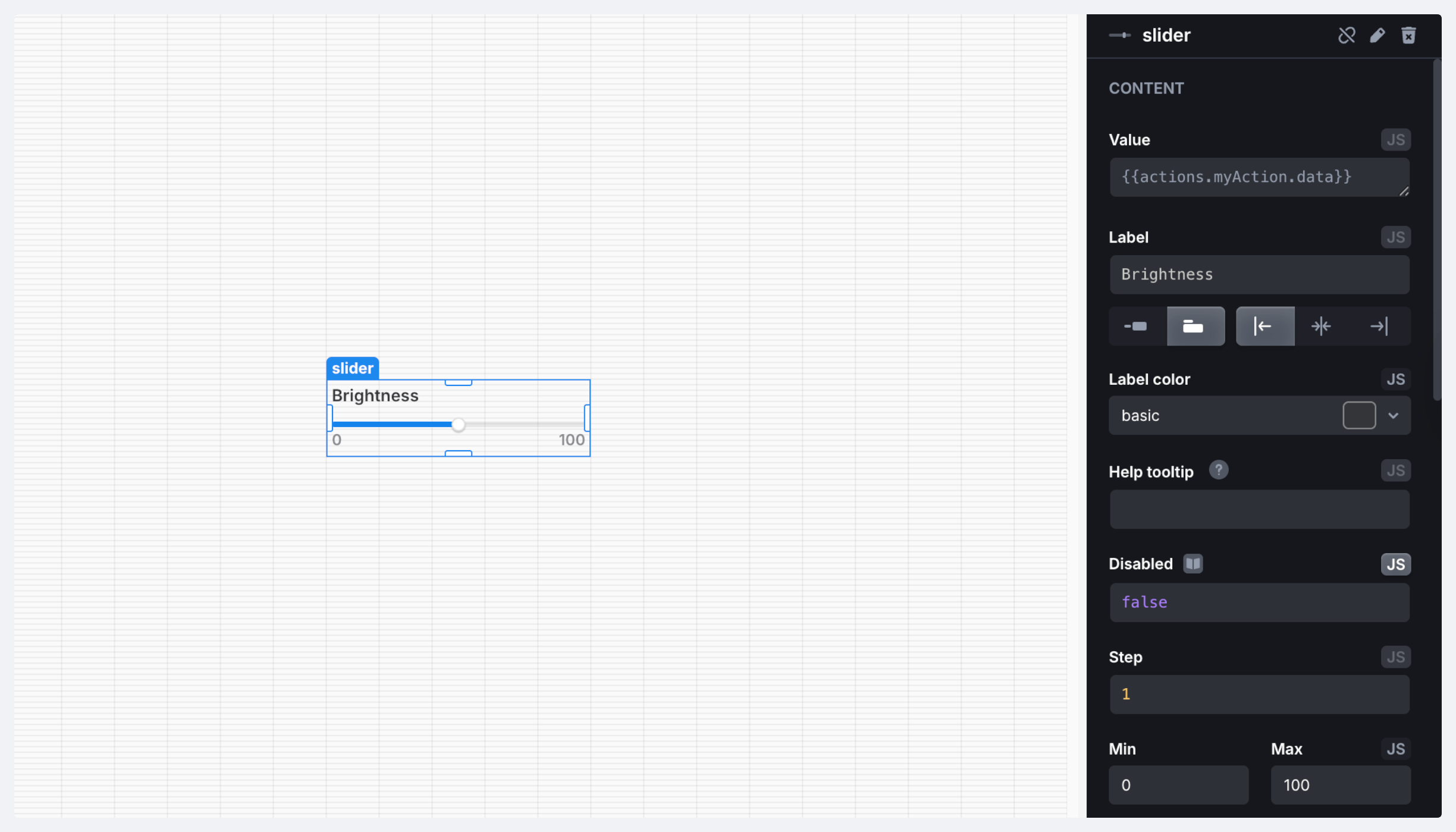 A slider for selecting a number between two values. The component supports minimum/maximum limits, step size, and custom rules validation.