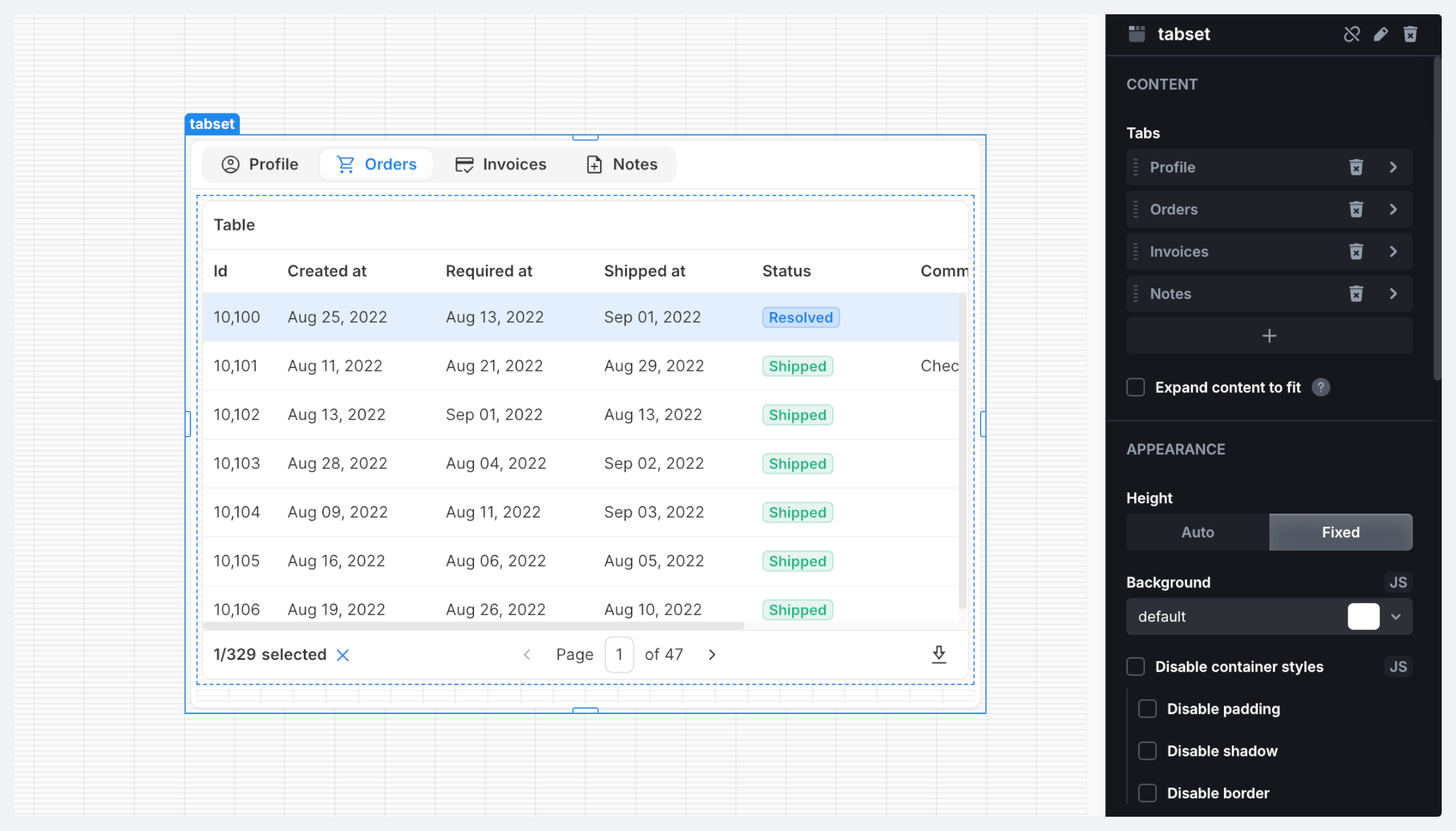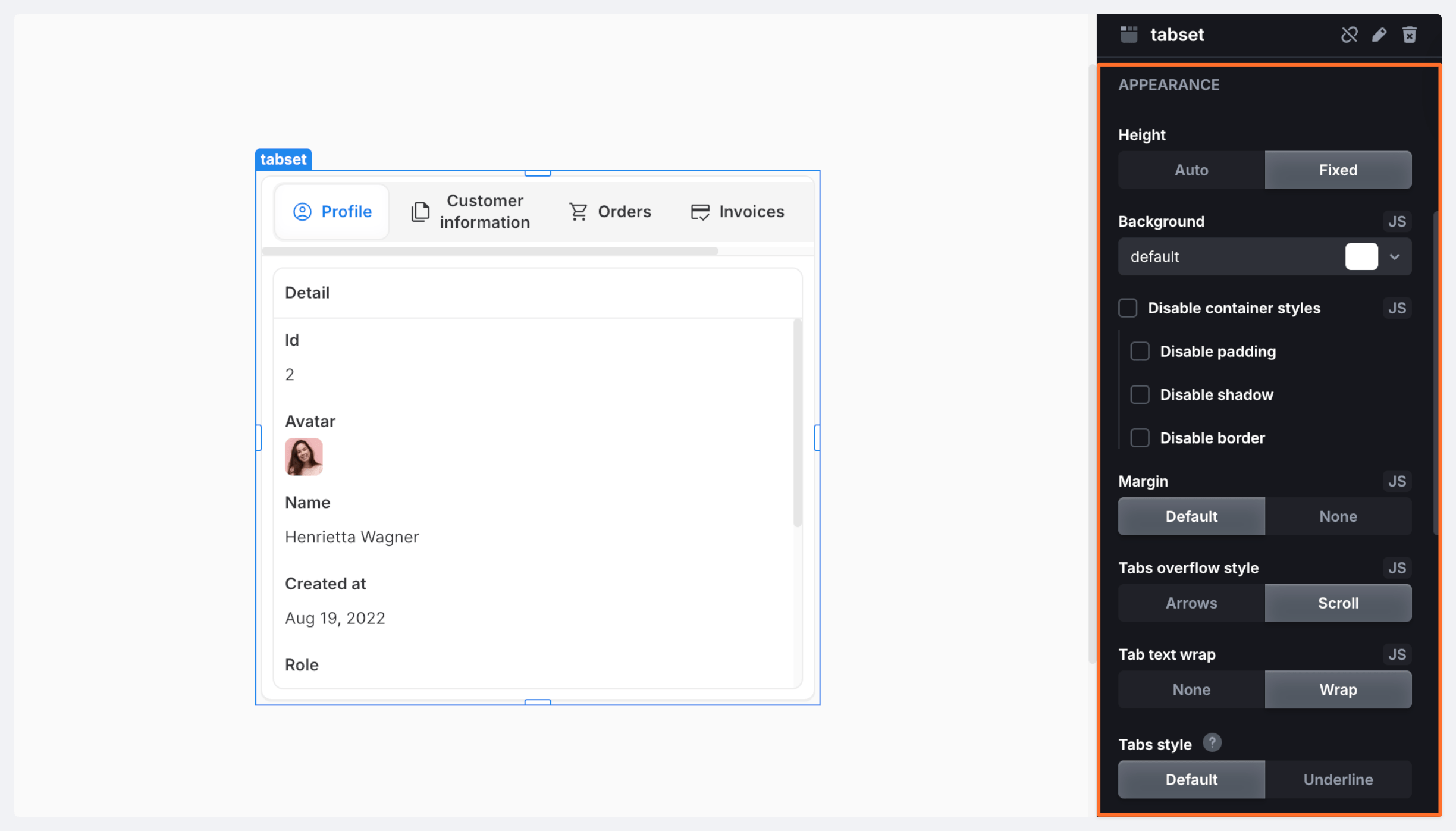 The Tabset component allows you to easily switch between different views. Each tab serves as a container, so you can customize it with the necessary components.