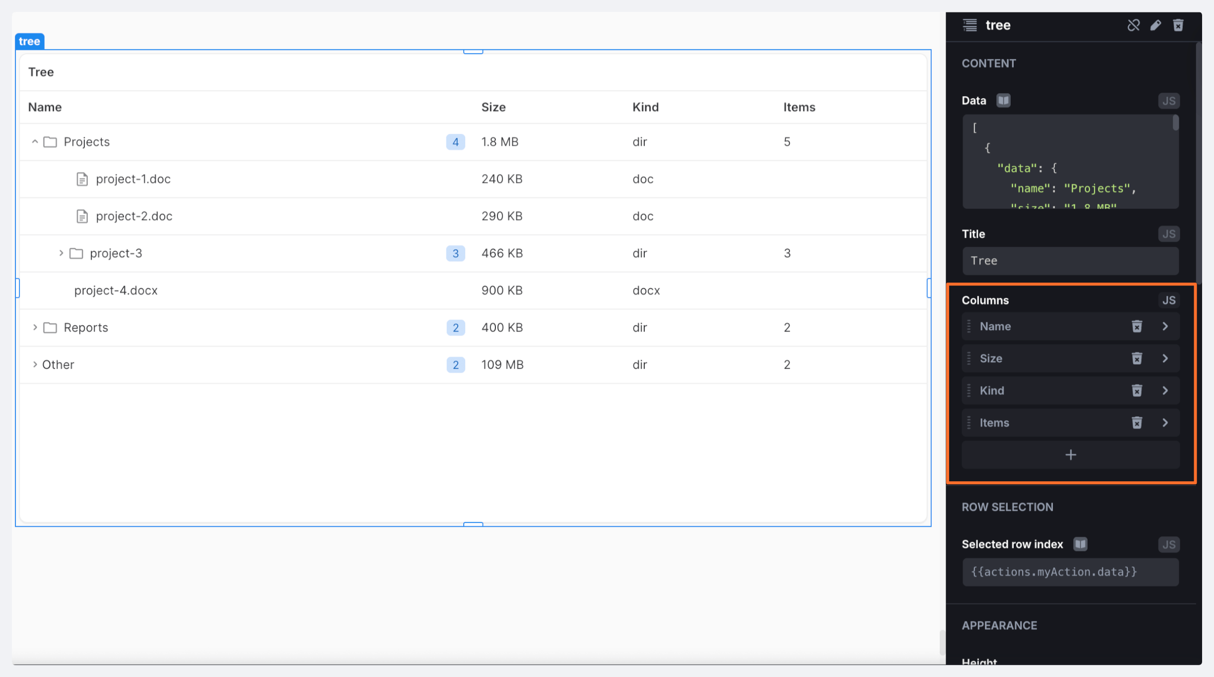 The Tree component has two configurable fields: *data* and *columns*.&#x20;