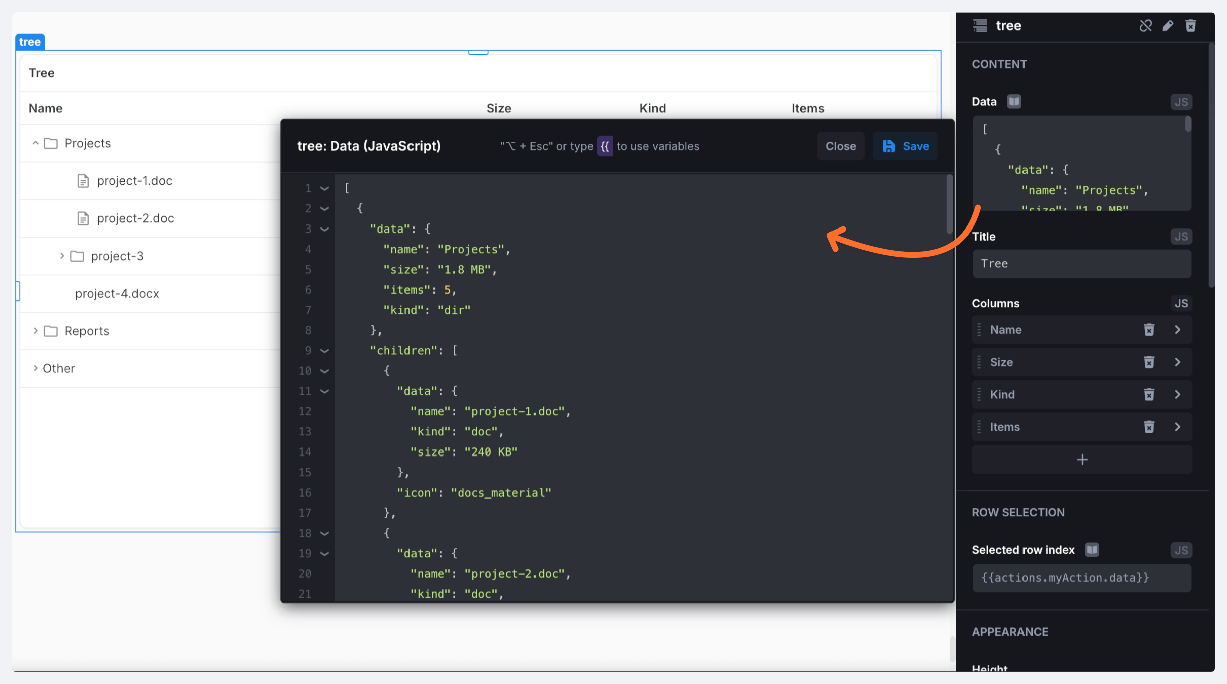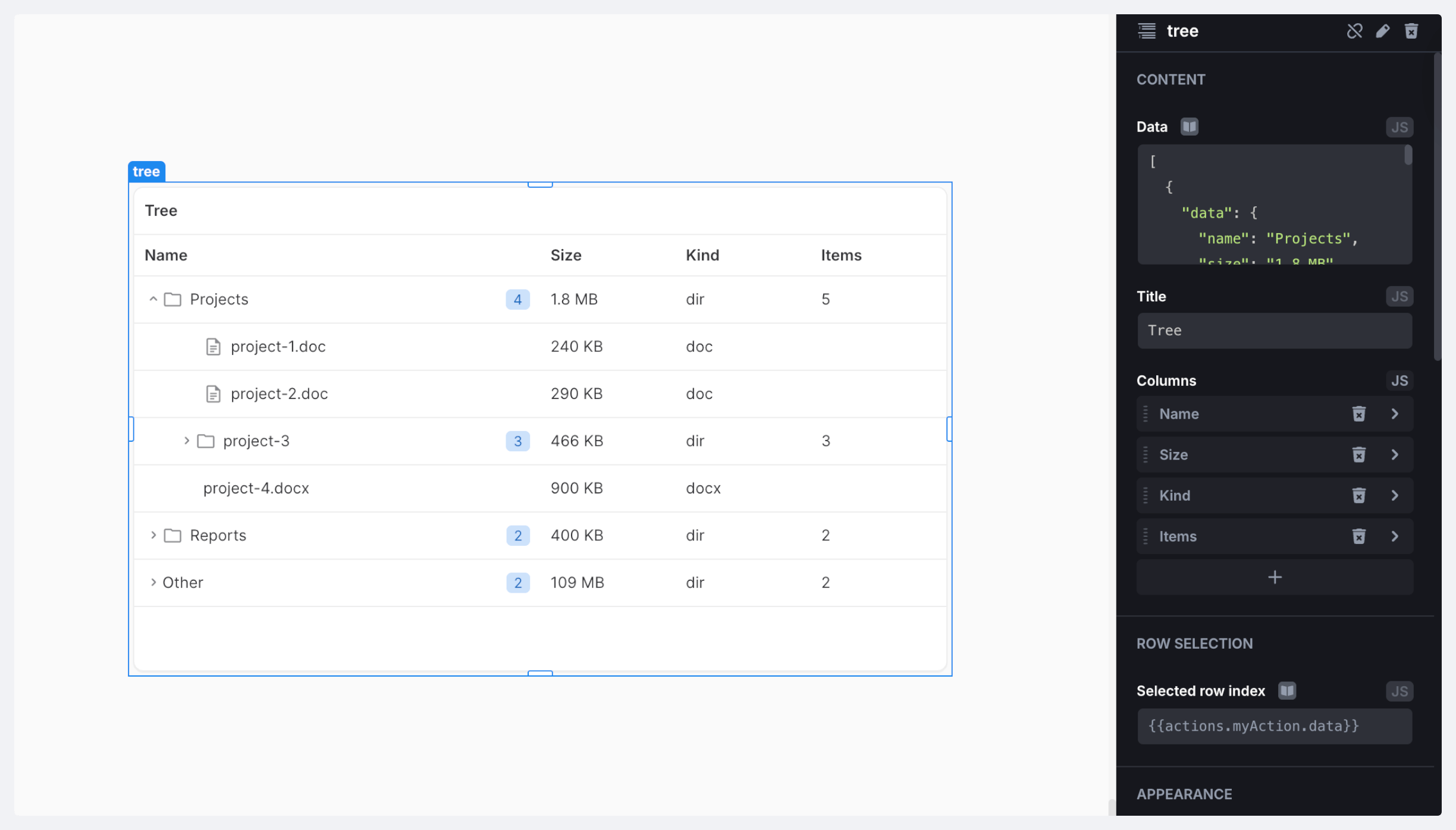 3. Add a Tree component to the canvas and assign the action from step 2 to the component's *Data* field.