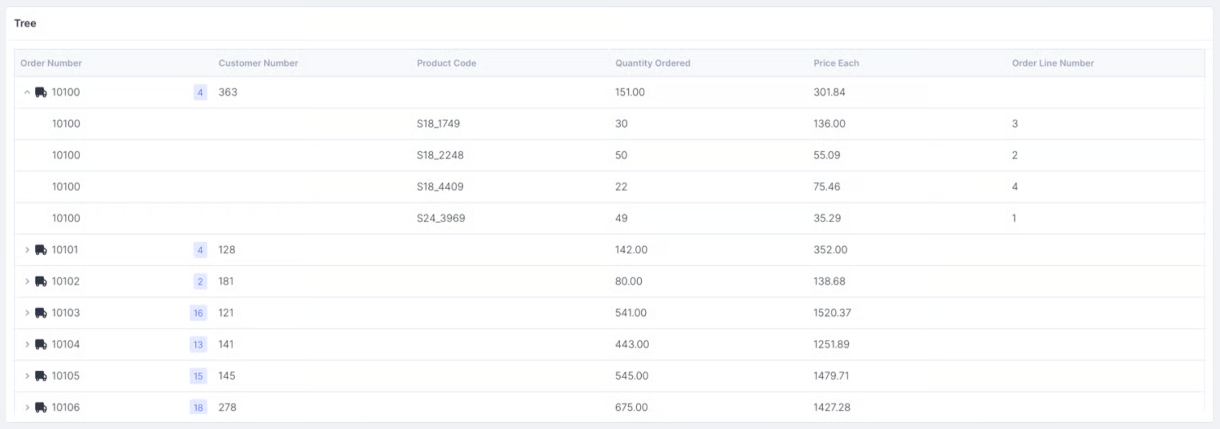 Let's say you have two tables - *Orders* and *Order details* - and you want to display the list of orders in the Tree component so that each order can be expanded showing its details. Here's how you can configure it: